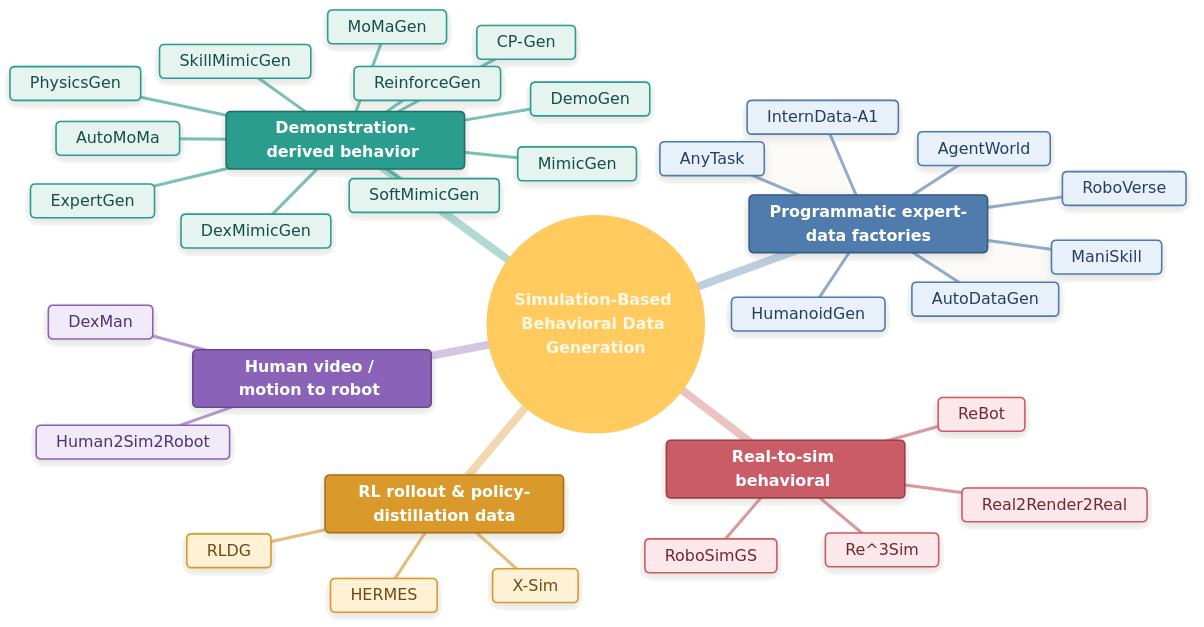 | Programmatic expert factories | Use simulation as a mass-production environment for scripted/planned experts | Large-scale expert episodes |