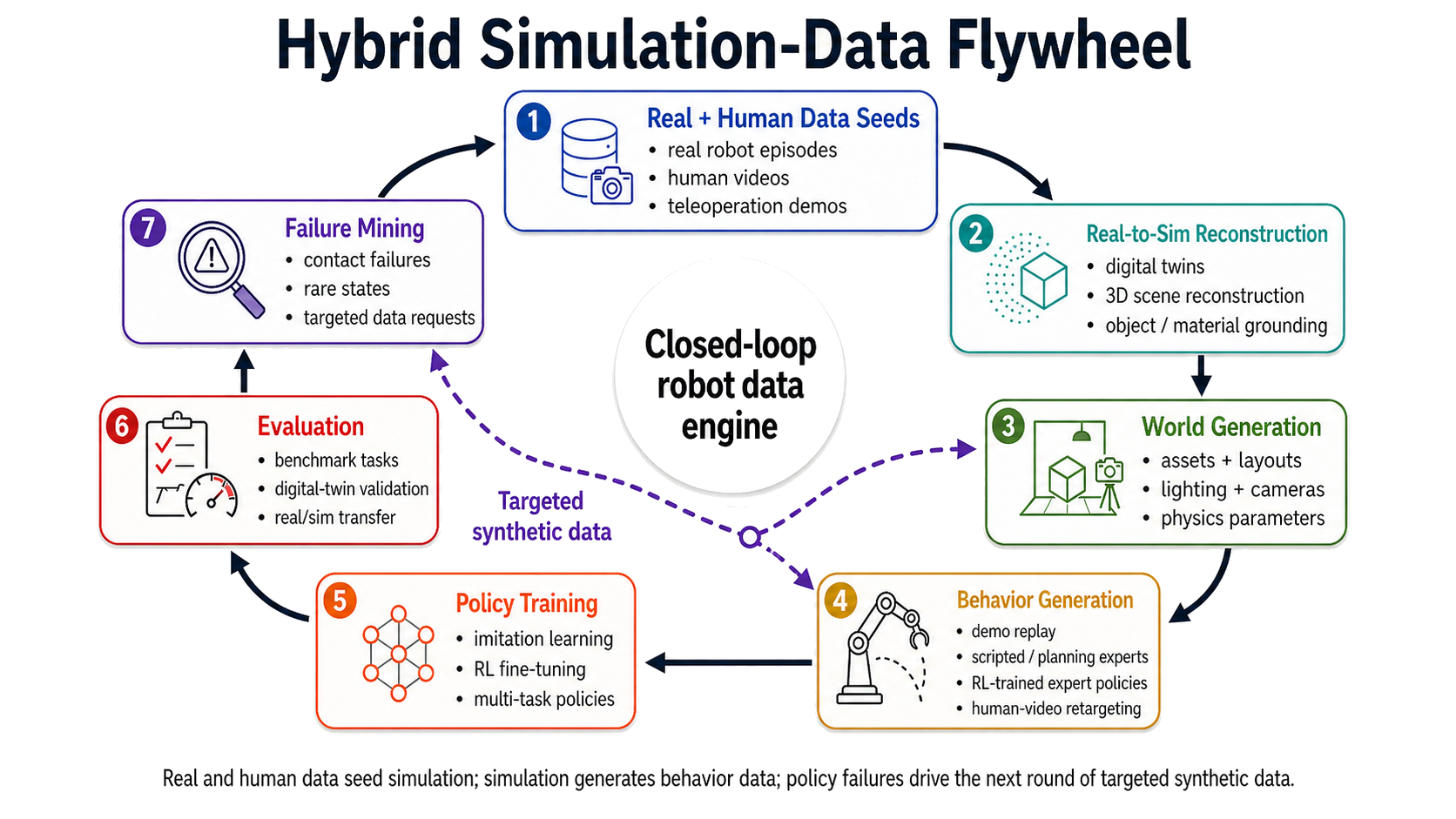 The winning system is unlikely to be “the best single data-generation paper.” It will be the system that connects these engines into a controllable, measurable, and repeatable simulation pipeline.