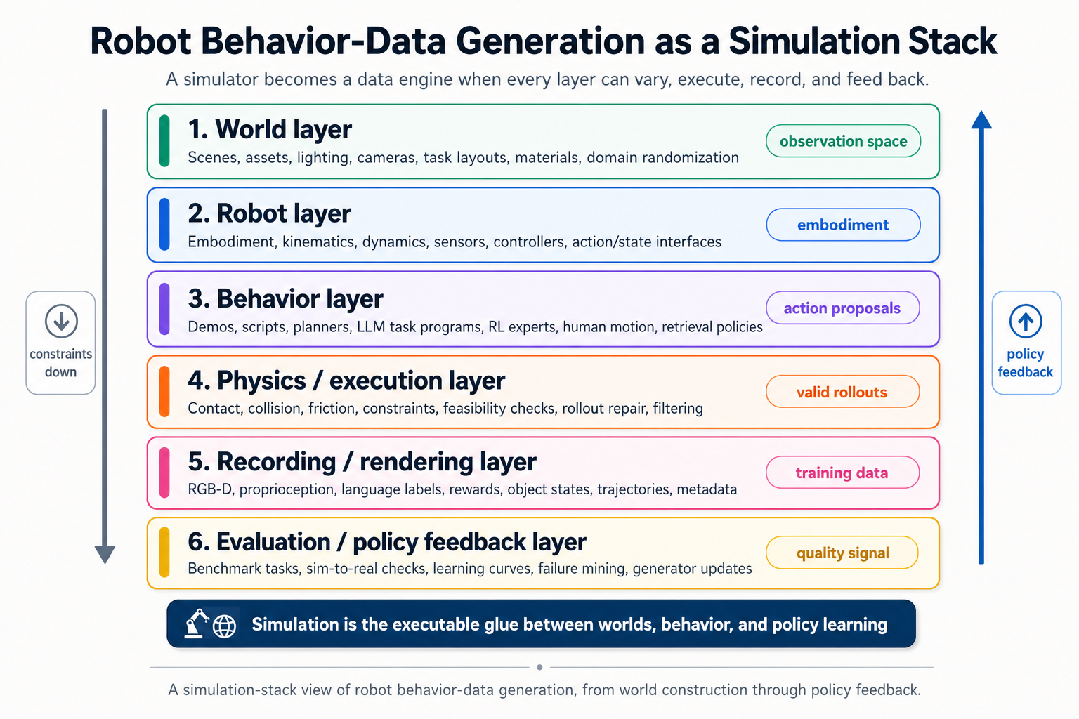 This is why recent robot data-generation work should not be read only as “new augmentation methods.” A better way to read it is as a search for simulation-based behavior-data engines.